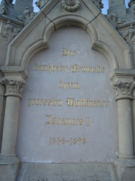 40leté výročí vlády knížete bylo pro jeho rodnou obec Lednici příležitostí poděkovat poctou Janu II. za jeho často prokazovaná dobrodiní. Návrh tehdejšího knížecího ředitele stavebního úřadu a pozdějšího profesora Německé techniky v Praze Karla Weinbrennera zřídit na náměstí kašnu s portrétním medailónem byl přijat městskou radou a došlo také k jeho realizaci.