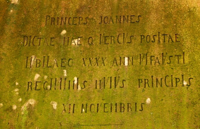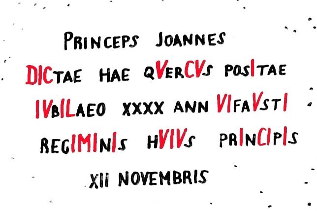 Nápis na následující fotografii ukrývá chronogram. Některá písmena v nápisu jsou větší než ostatní. Z velkých písmen však počítáme pouze ta, která odpovídají římským číslicím (počáteční "P" a "J" se tedy k výpočtu chronogramu nevyužije). Pro lepší čitelnost je nápis přepsán na obrázku vpravo a velká písmena zahrnutá do výpočtu jsou zvýrazněna navíc ještě červenou barvou.