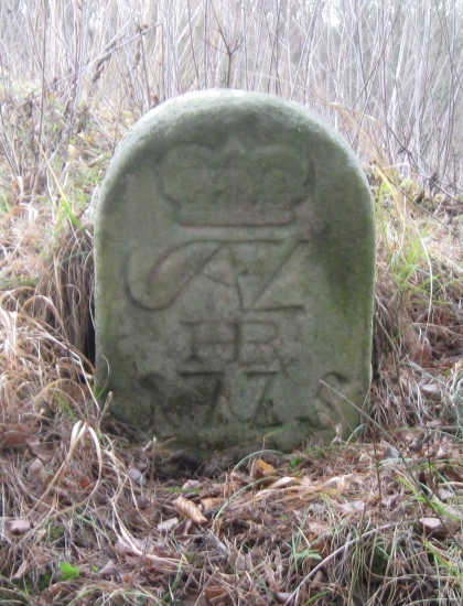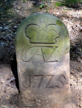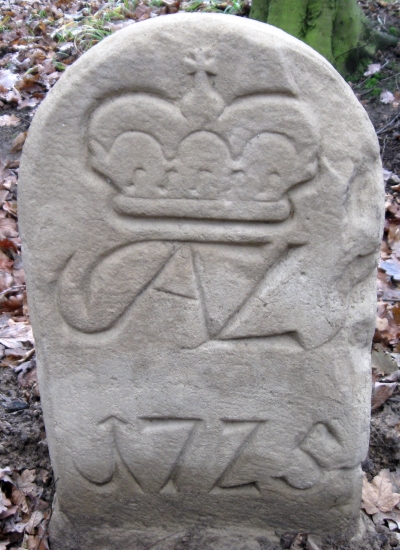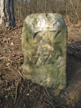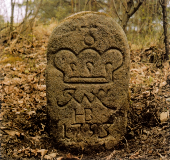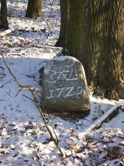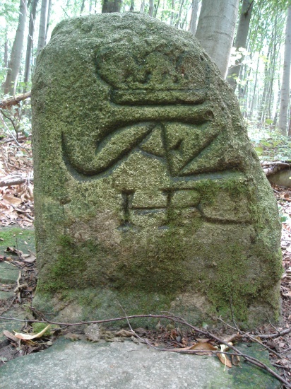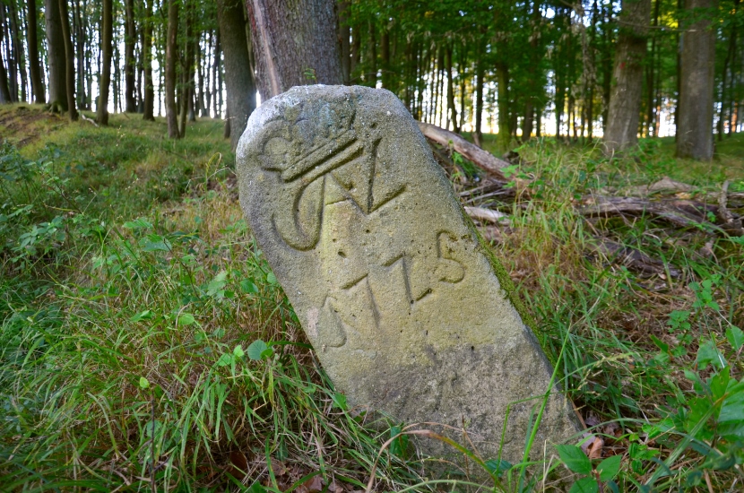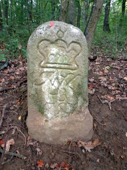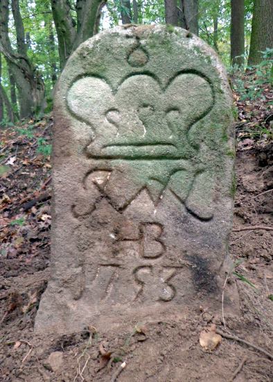 Vlevo dva hraniční kameny se zkratkou JWVL - iniciály Josefa Václava z Lichtenštejna (JWVL = Josef Wenzel Von Liechtenstein).
