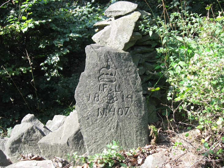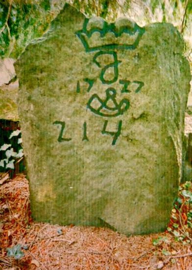 Na hraničním kameni z roku 1814 je vyryta korunka, iniciály I.F.v.L., symbol lovčího rohu a pořadové číslo. Lovčí roh symbolizuje Krnovské knížectví.