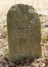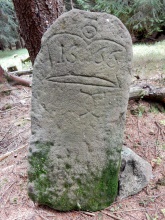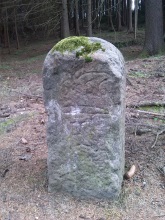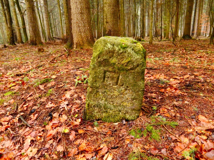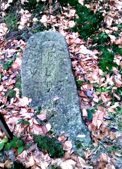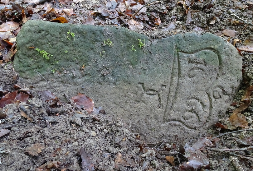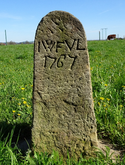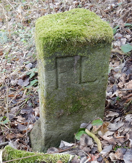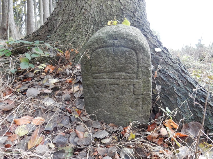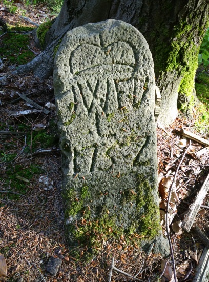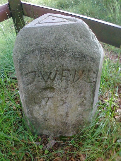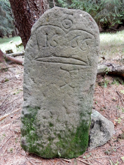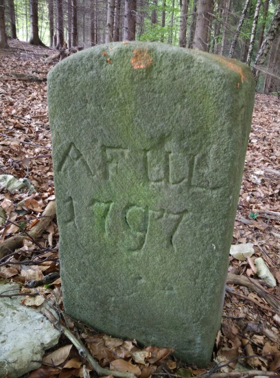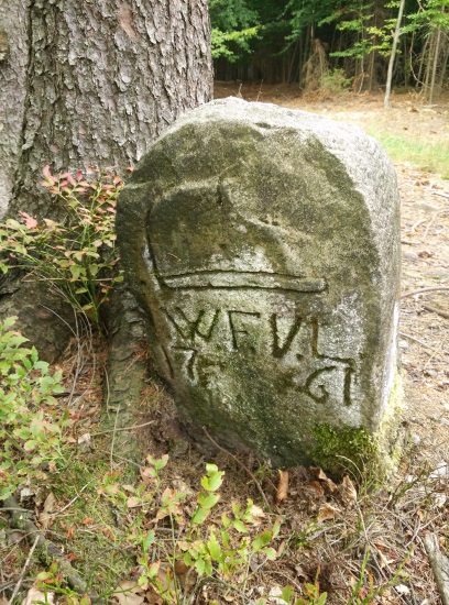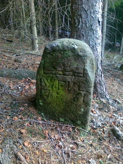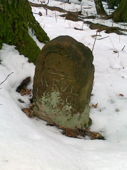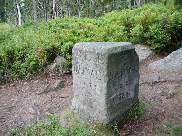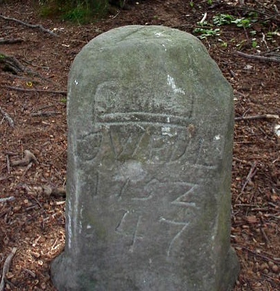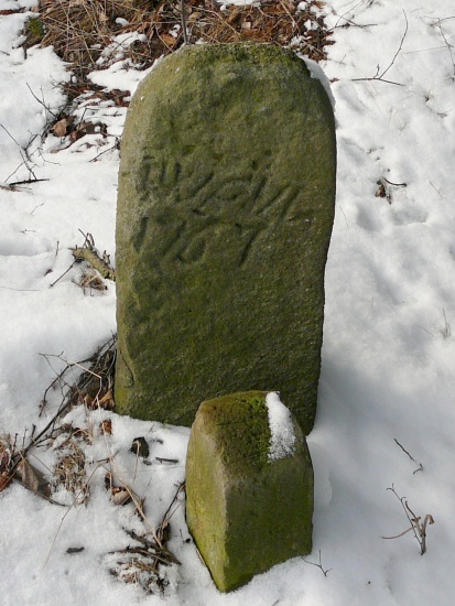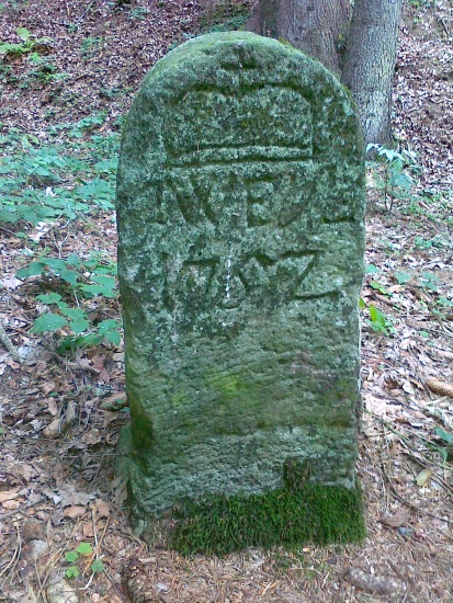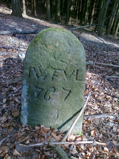 Trojboký hraniční kámen s iniciálami IWFVL a letopočtem 1752.