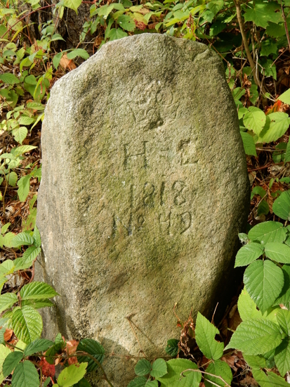 Na kameni z roku 1818 je vyryta knížecí koruna a nápis HE = Herrschaft Eisenberg.