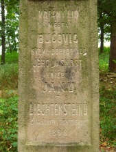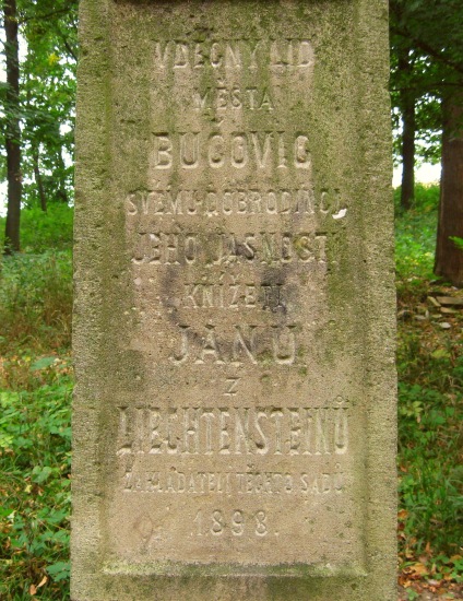 Vděčný lid města Bučovic svému dobrodinci Jeho Jasnosti knížeti JANU z LIECHTENSTEINŮ zakladateli těchto sadů 1898.