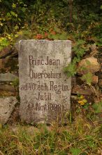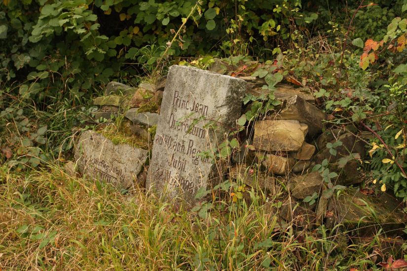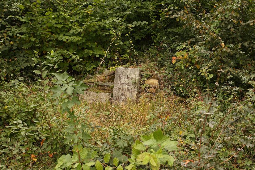 Nápis je zvýrazněn červenou barvou. Bohužel při opravě došlo k chybě, místo „Joan“ je zvýrazněno „Jean“. Vlevo je zasazena menší doplňková tabulka, na jejíž zarovnané ploše ve tvaru erbu nalezneme vyrytý nápis:
