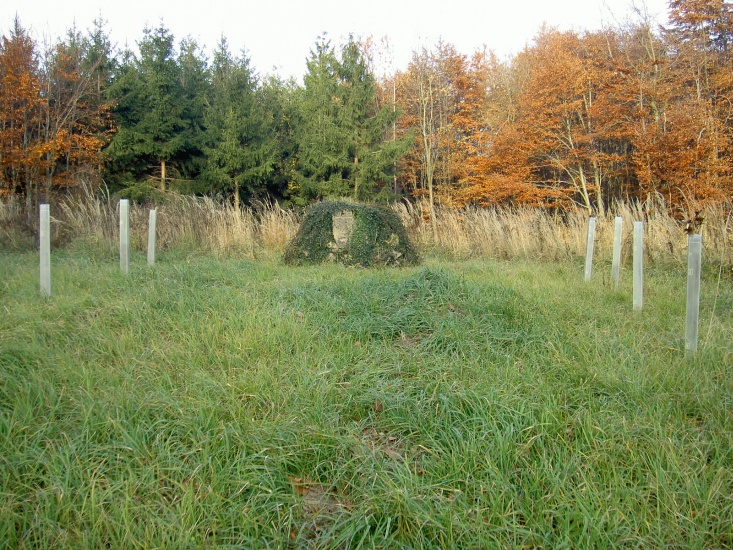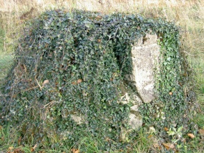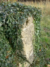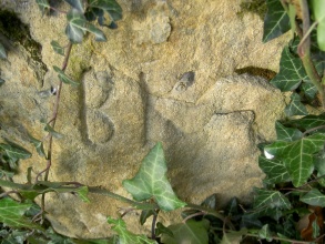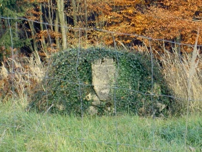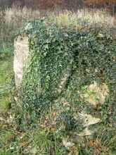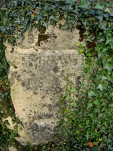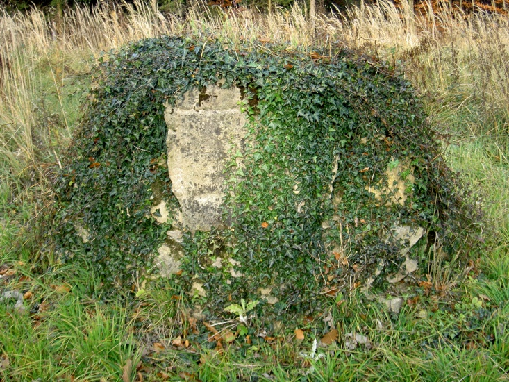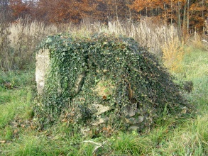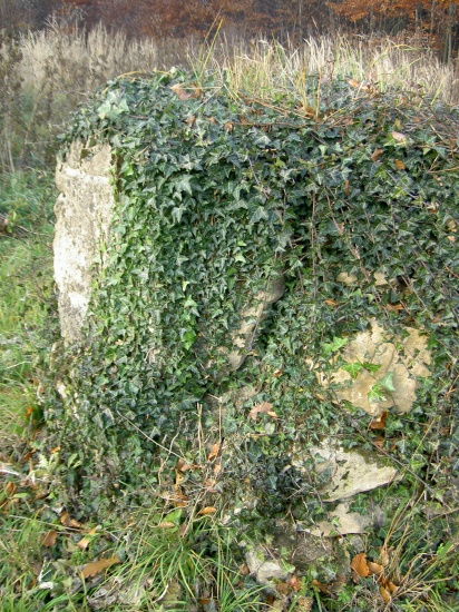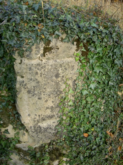 Zvětralý kámen s pozůstatky následujícího německého nápisu (v hranatých závorkách je předpokládaný text v části zakryté břečťanem):