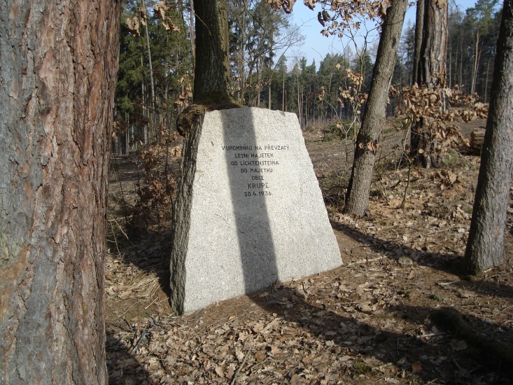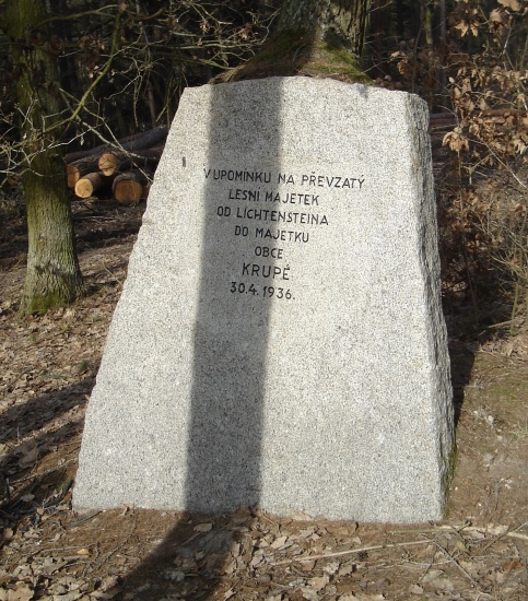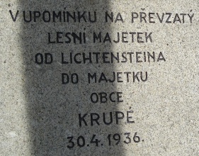 V upomínku na převzatý lesní majetek od Lichtensteina do majetku obce Krupé 30. 4. 1936