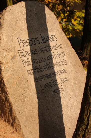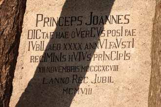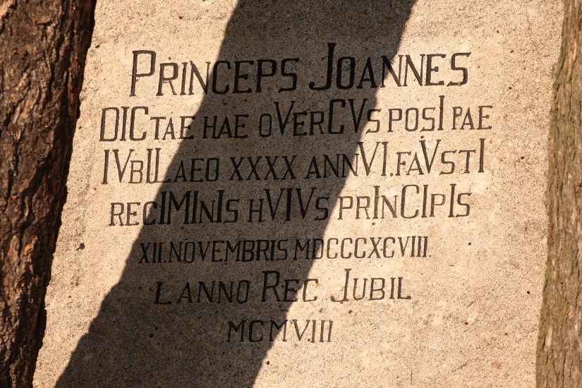 Princeps Joannes DICtae hae oVerCVs posIpae IVbILaeo xxxx annVI faVstI regIMInIs hVIVs prInCIpIs xii novembris MDCCCXCVIII. L. anno Reg. Jubil. MCMVIII