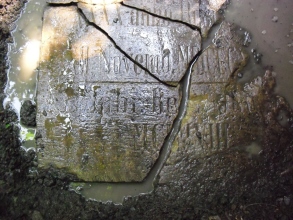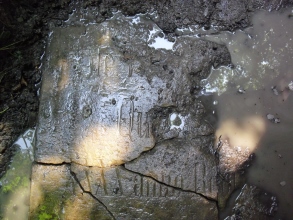 Torzo původní pamětní desky bylo odkryto v lesích jižně od hájovny Halda. Deska je v důsledku dlouhodobého uložení v mokré zemině silně poškozená. Přesto je možno přečíst původní podobu nápisu: