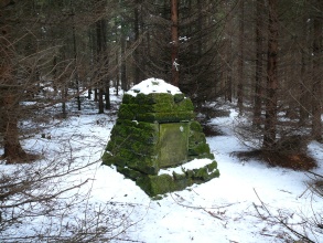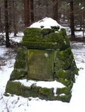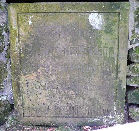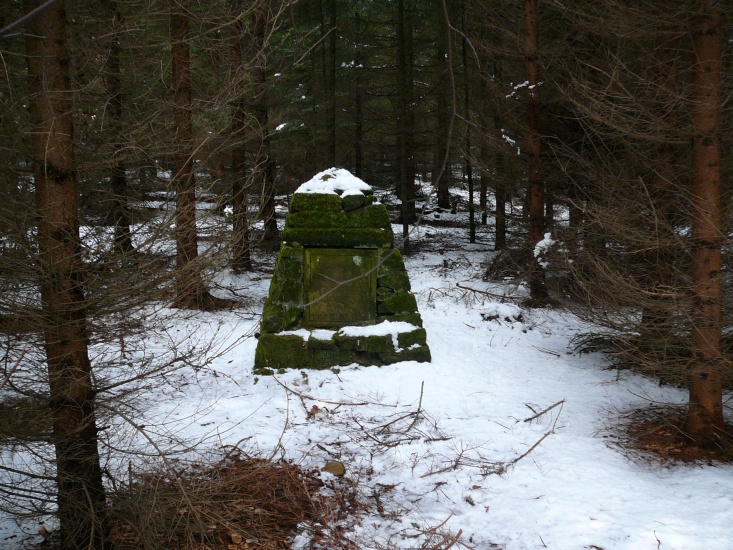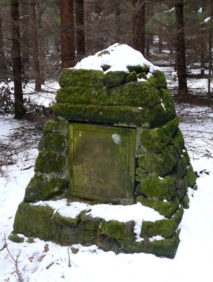 Čtyřboká zděná mohyla, do které je zasazena kamenná deska s obtížně čitelným latinským nápisem (v závorkách jsou doplněny setřené části textu pravděpodobnou domněnkou):