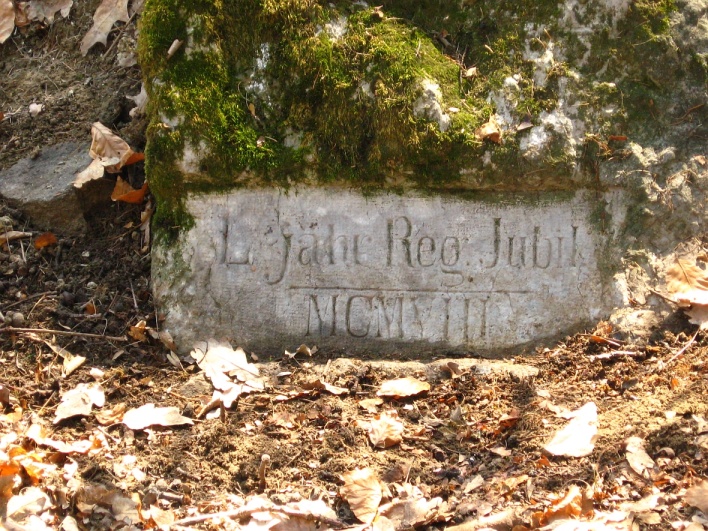 Torzo památníku, z něhož byla nalezena pouze menší deska z roku 1908 na rozvalené kupce kamenů. Horní část kamene je porostlá mechem. V hladce urovnané obdélníkové ploše je vyryt nápis „L jähr. Reg. Jubil. MCMVIII“. Památník se nachází u křižovatky lesních cest „U Wiehlovy boudy“. Za objevení tohoto památníku vděčíme panu Kohoutovi z Pozořic.