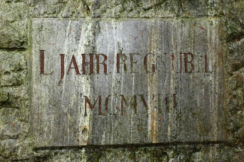 Součet římských číslic v chronogramu v latinské části nápisu udává datování rokem 1898. Před tímto kamenem je umístěna doplňující tabulka z r. 1908, zhotovená z jiného druhu kamene. Na tabulce je vyrovnána obdélníková plocha, na níž je vyryt nápis „L JAHR REG. JUBIL. MCMVIII“. Památník se nachází v blízkosti místní hájenky na 15. poledníku.