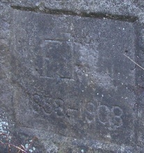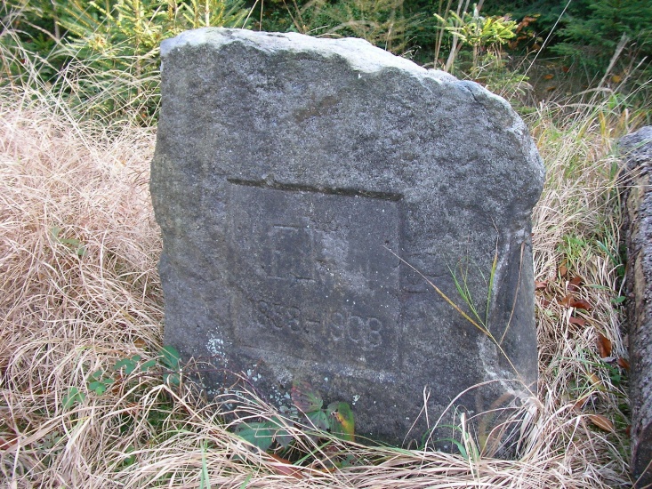 Kamenná deska, na jejíž lícové straně je hladce vyrovnána čtvercová plocha, v níž je vyryt nápis „FJL 1858-1908“.