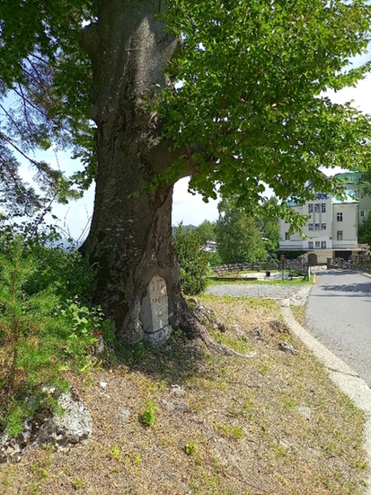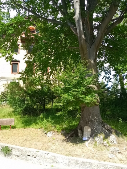 Pamětní kámen knížete Jana II. z Lichtenštejna z roku 1904. Kámen je vrostlý do kořenů mohutného stromu. Nápis na kameni: