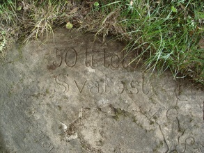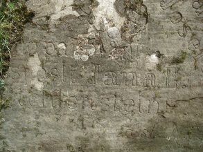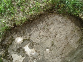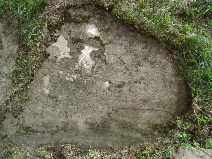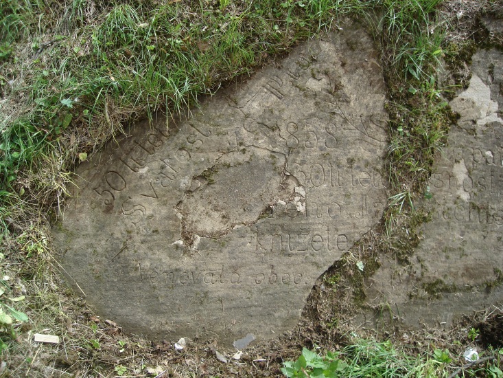 Rozměrná kamenná deska, zapuštěná do travnatého břehu v areálu kostela. Pamětní deska byla zbudována obcí v roce 1908 a nese následující nápis (předpokládaná domněnka je v hranatých závorkách):